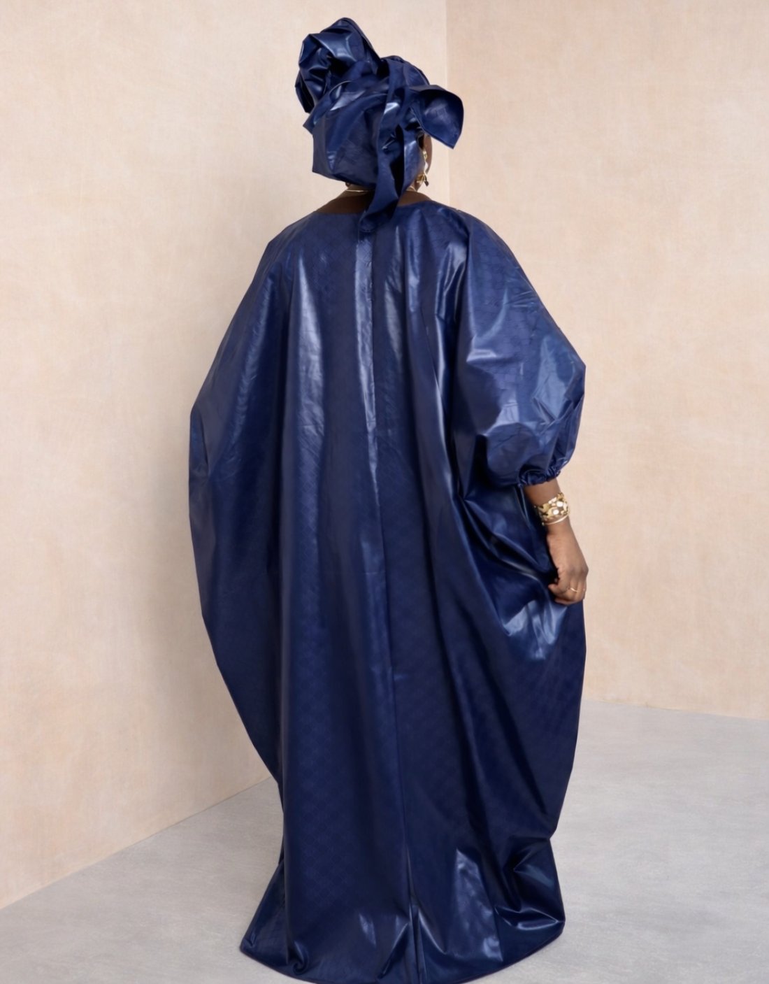 A richly textured blue Bazin gown (Shadda) and matching turban.
