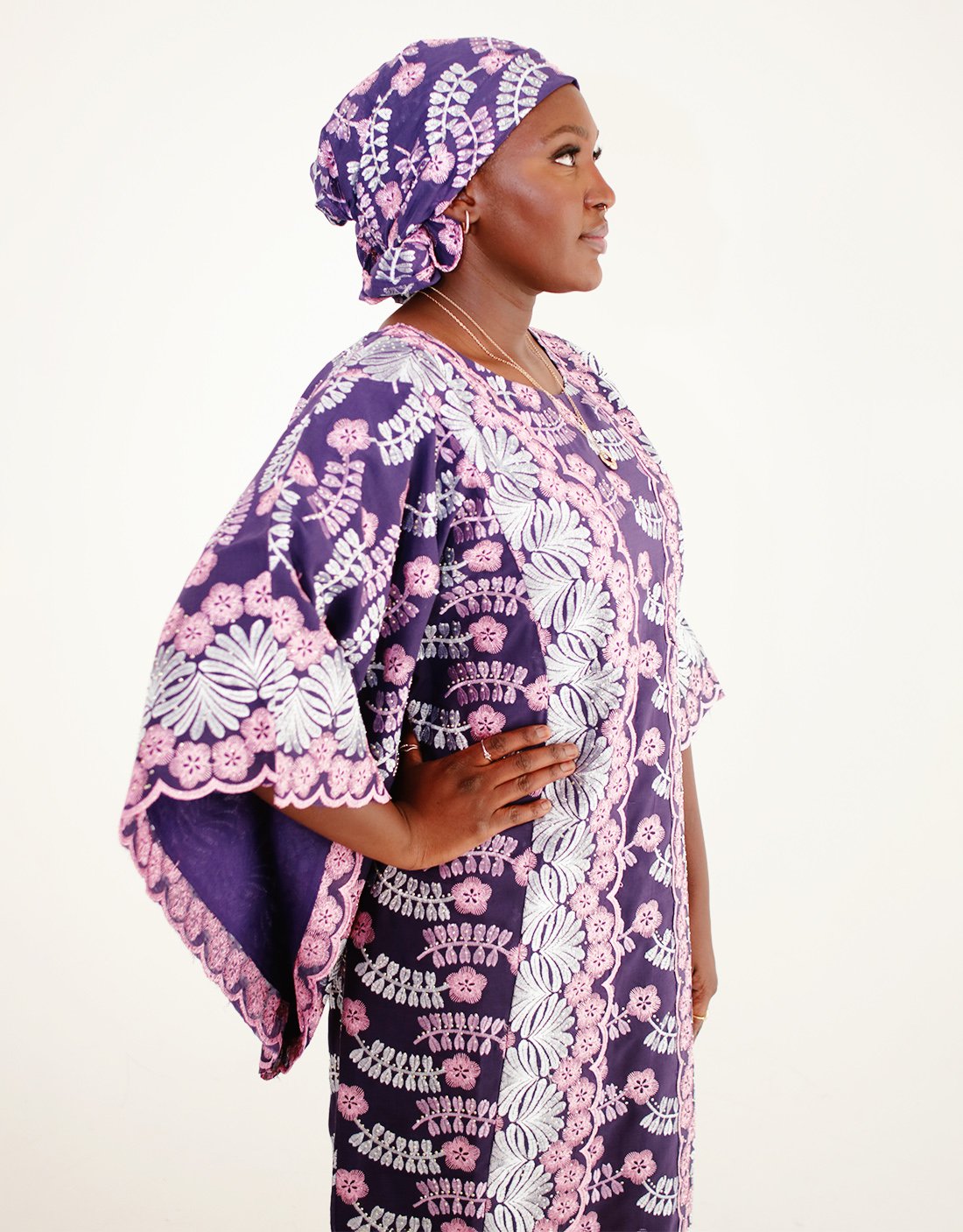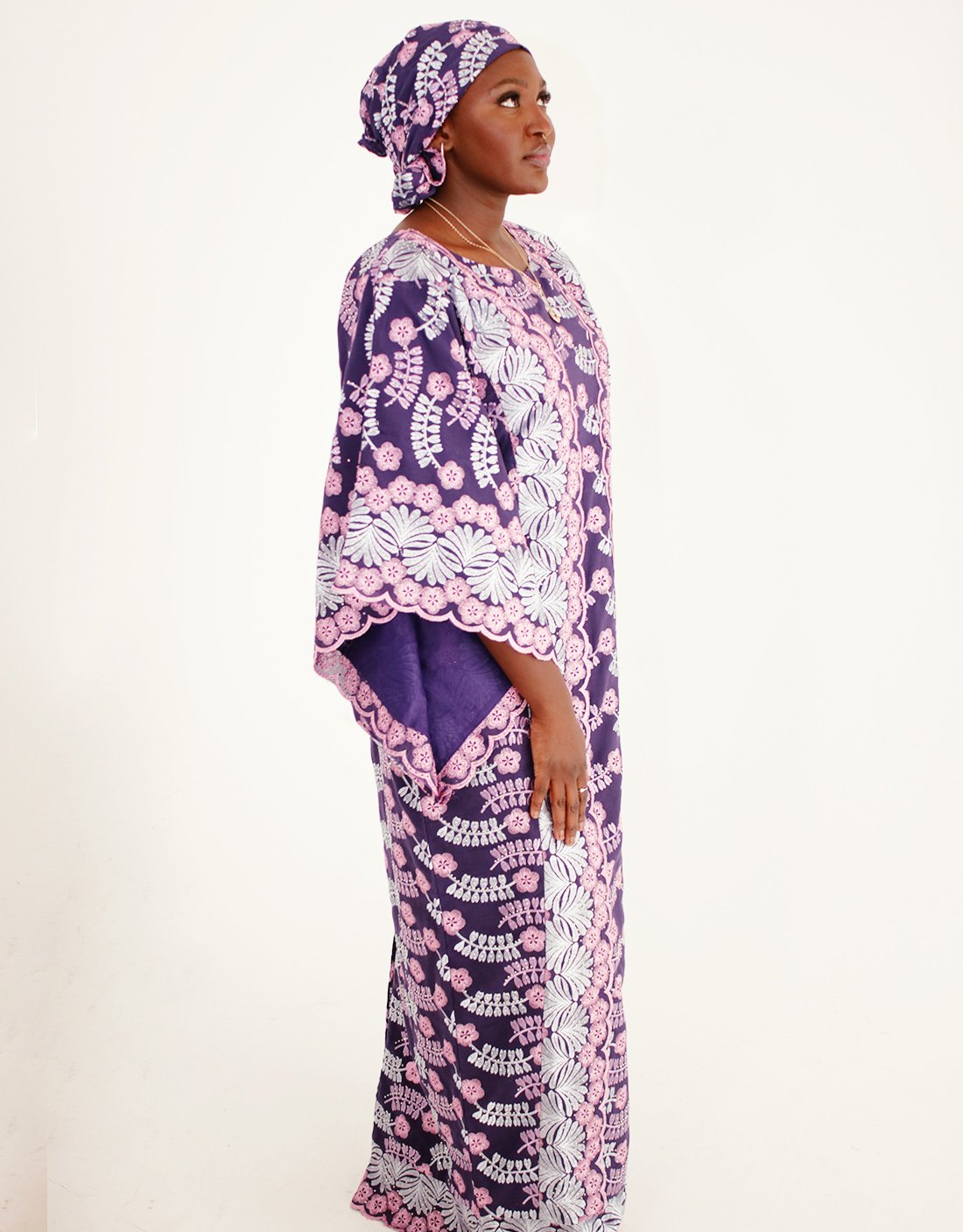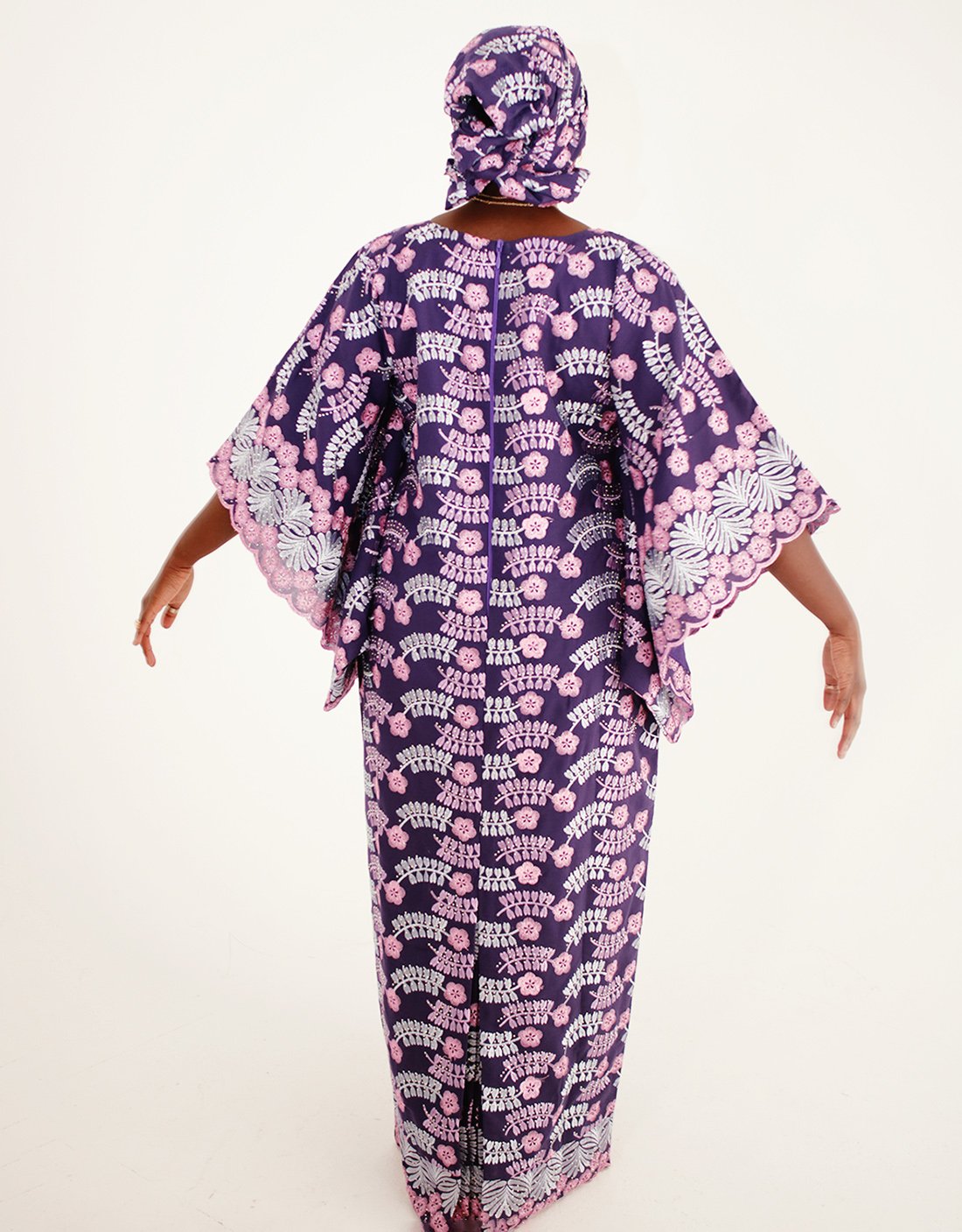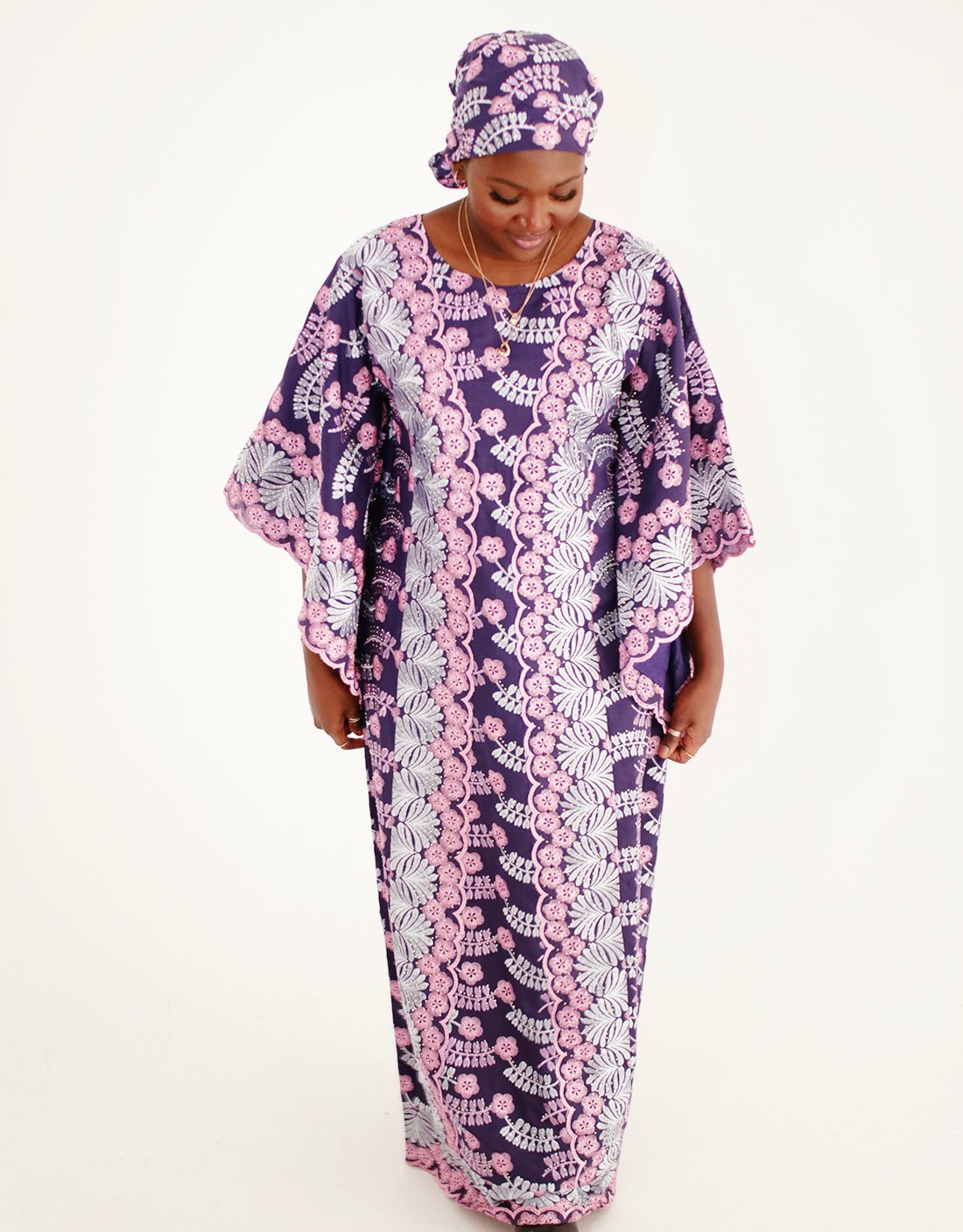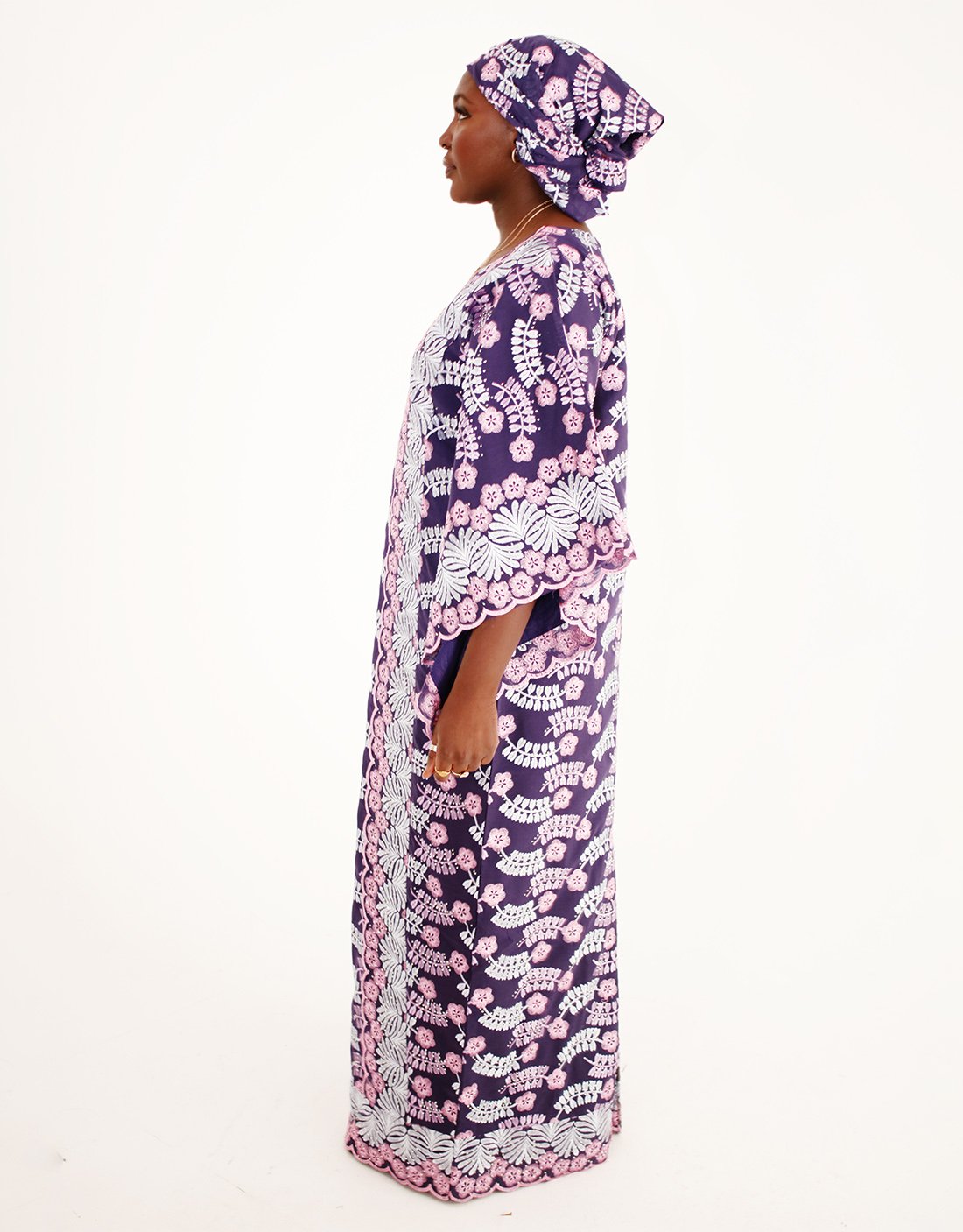 A purple Swiss lace modest dress, fully lined for coverage and comfort, finished with a modest pleated slit. Includes a matching headscarf. Designed in a universal fit.  Available in Petite (Length 54″), Regular (Length 58″), and Tall (Length 62″).