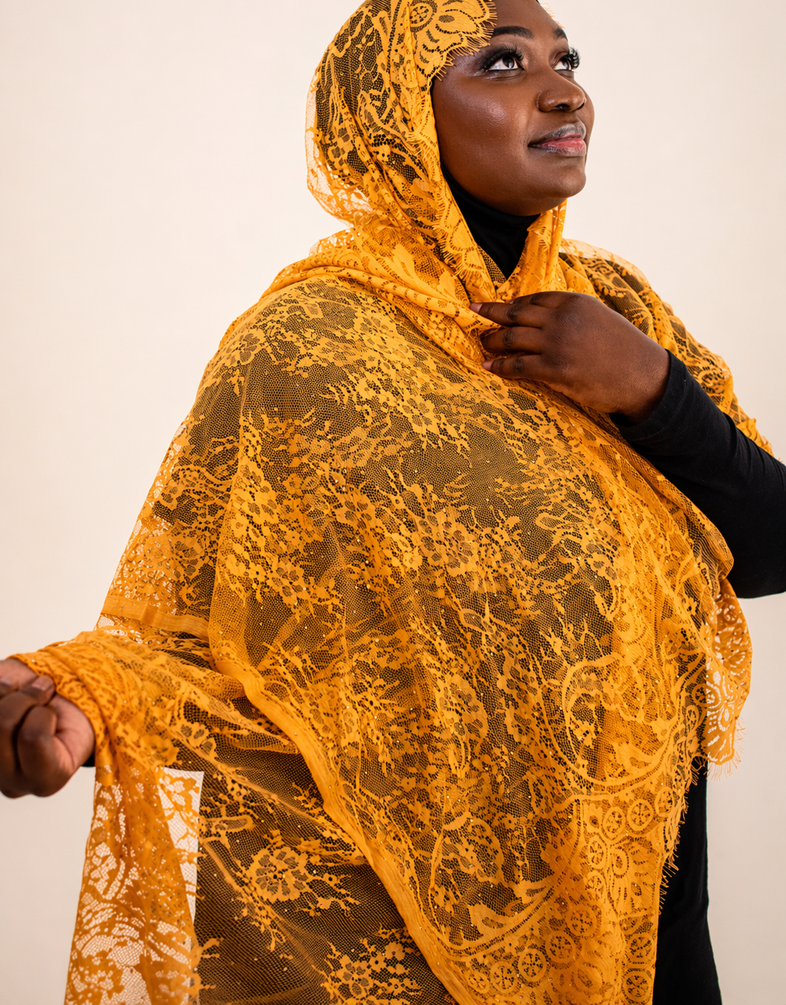 A bold mustard yellow lace midi mayafi with soft embellishment and flowing movement.