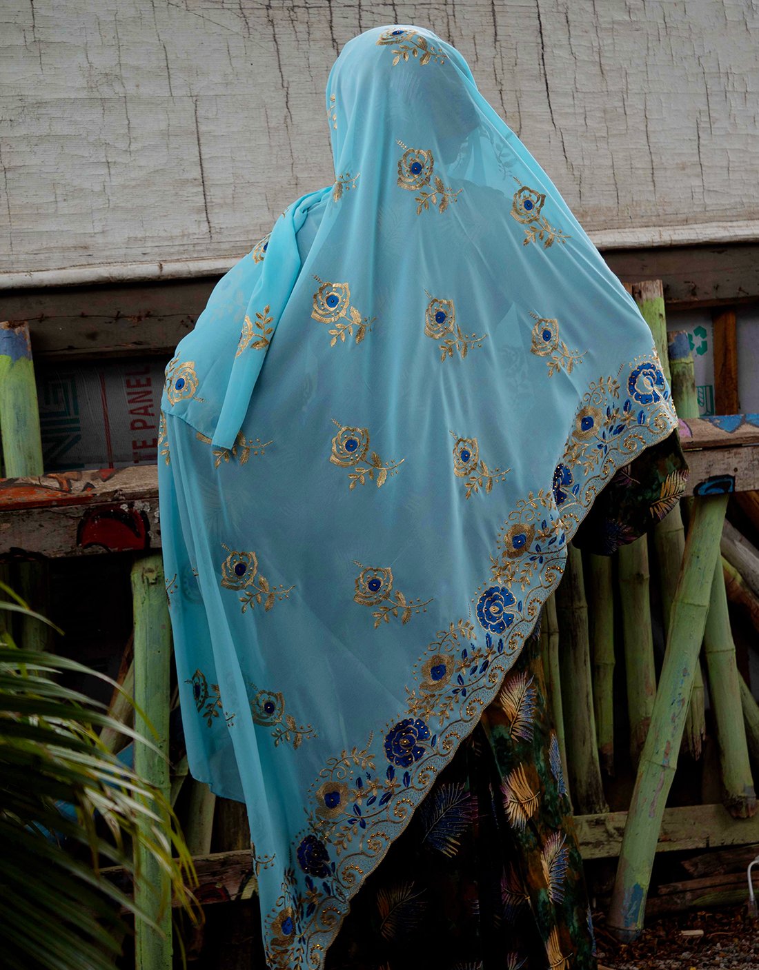 The Lamisi Blue Mayafi introduces a new embroidered design to Sonjiki’s growing collection. Crafted in soft, airy chiffon in a gentle baby blue tone, this maxi-length veil is adorned with large, gold-threaded rose motifs, each centred with dark blue embroidery for striking contrast. The florals are artfully scattered across the body, while one edge features a scalloped finish embroidered with rosebuds and leafy vines—a detail that adds texture, softness, and romantic elegance.