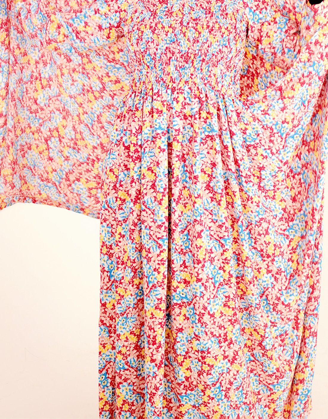 A pink floral crepe Melhfa dress, inspired by the Mauritanian Melhfa and reimagined as a ready-to-wear silhouette. Designed with an elasticated front detail, long sleeves, and a universal fit in Petite, Regular, and Tall lengths.age. Universal fit in Petite, Regular, and Tall lengths for everyday modest dressing.