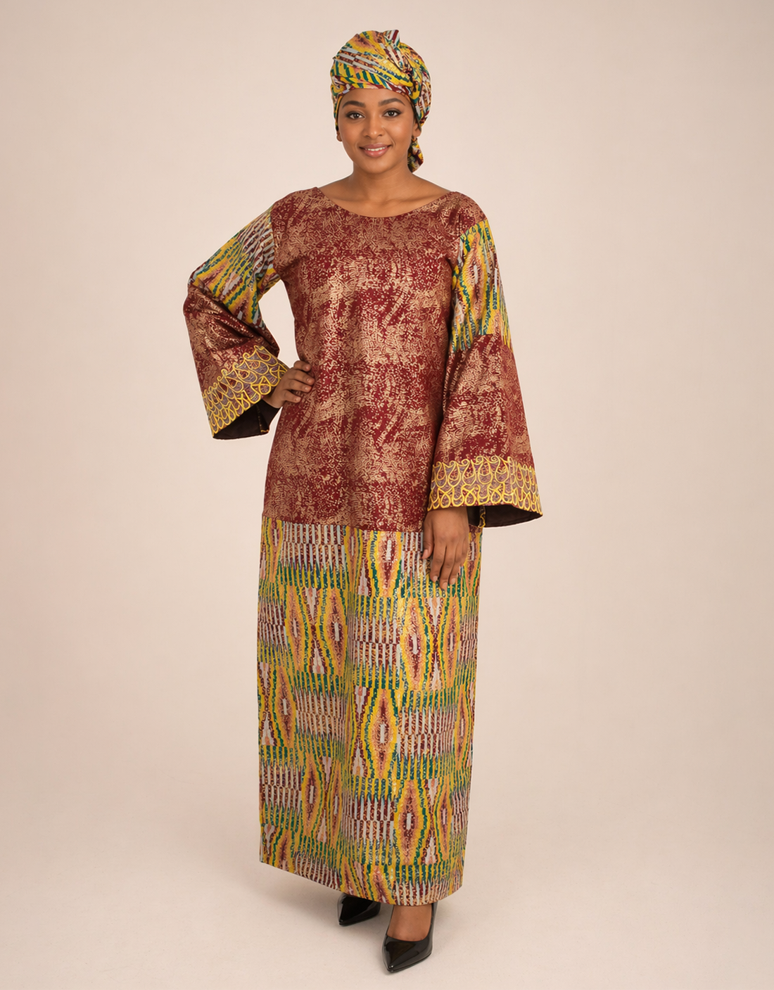 A brown kente-inspired print occasion dress featuring a mock kente design, embroidered cuffs, and a modest pleated slit. Fully lined and includes a matching headscarf. Available in UK 8–10 (Petite Length 54″), UK 12–14 ( Regular Length 58″), and UK 16–18 (Tall Length 62″) .