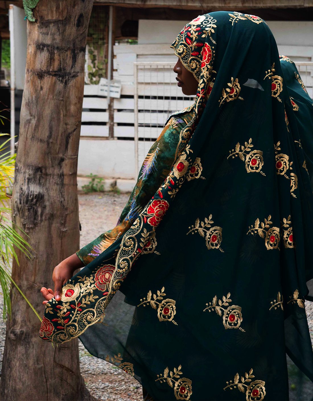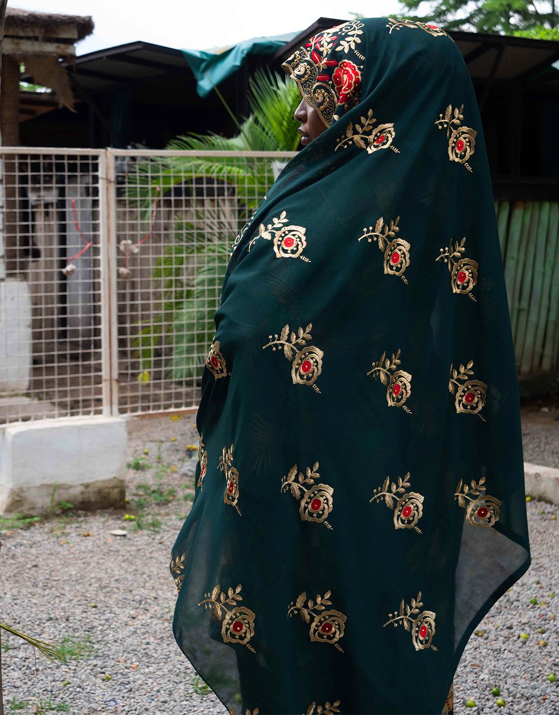 The Sakinatu Green Mayafi is a rich, grounded addition to Sonjiki’s embroidered collection. Made from soft chiffon in a deep forest green tone, this maxi-sized veil features scattered gold rose embroidery with vibrant red centres. Each bloom evokes warmth and confidence. A scalloped edge runs along one side, adorned with rosebuds and leafy vines for added softness and dimension.