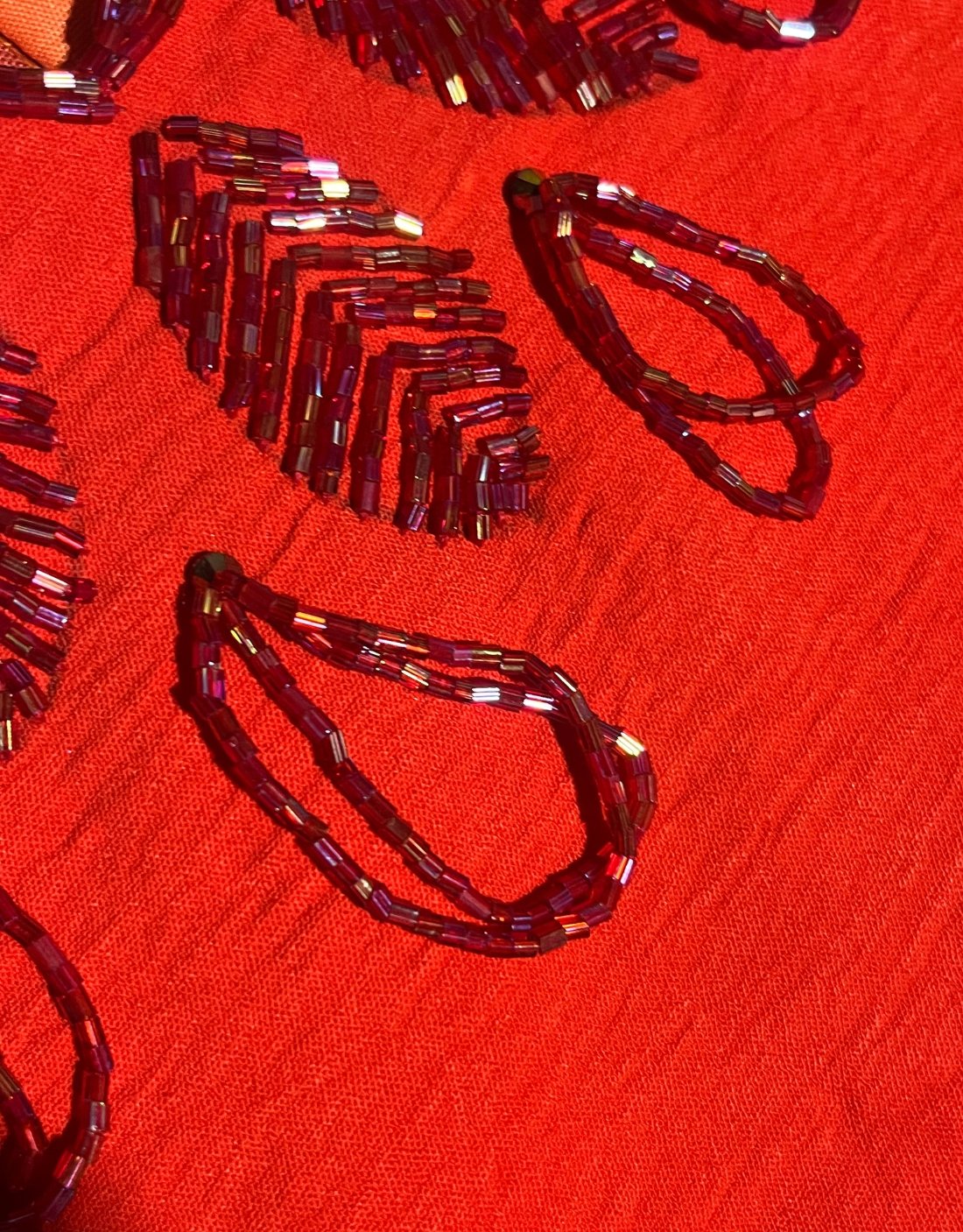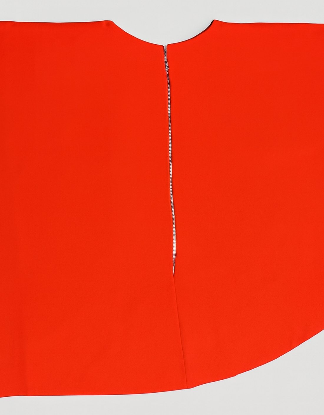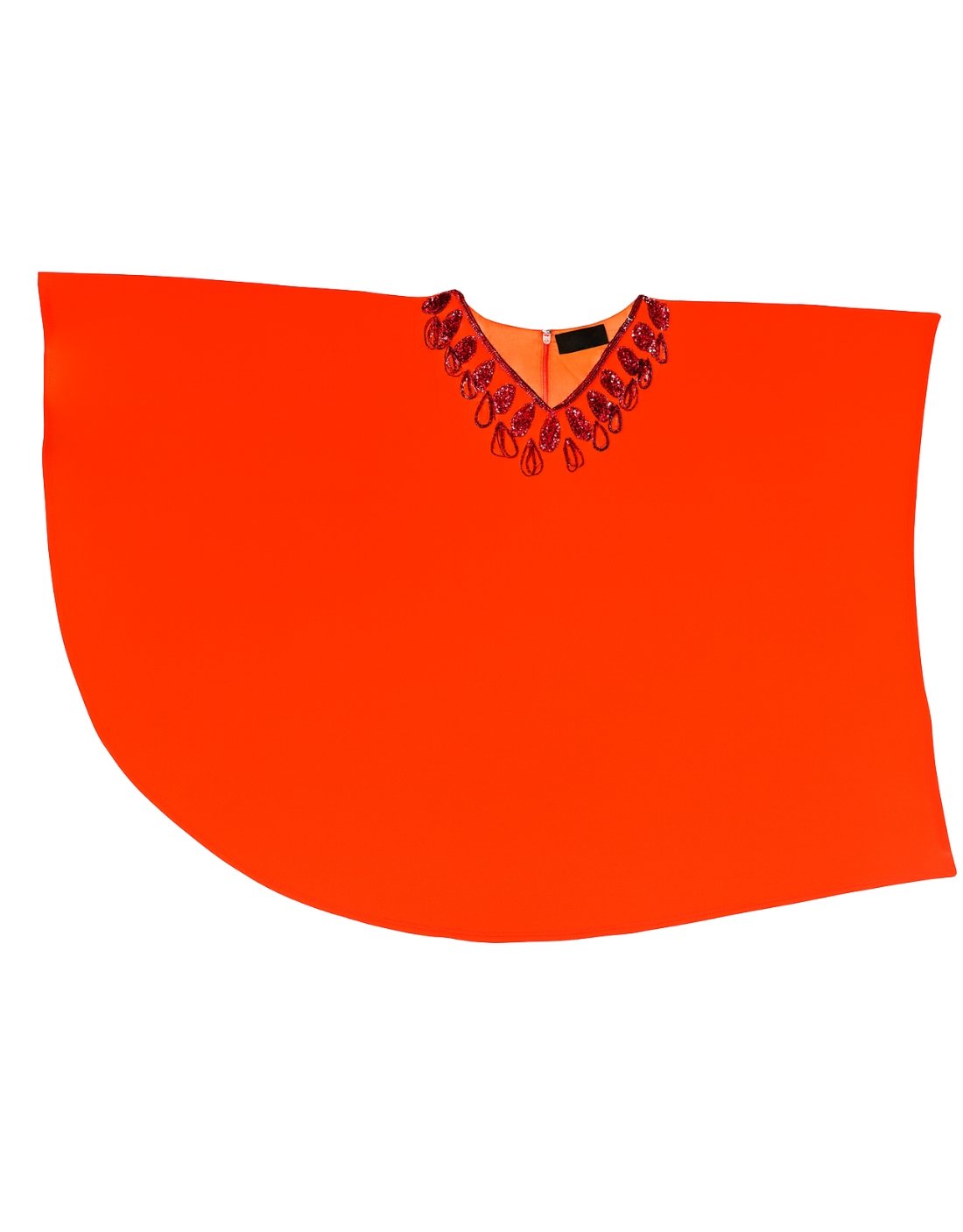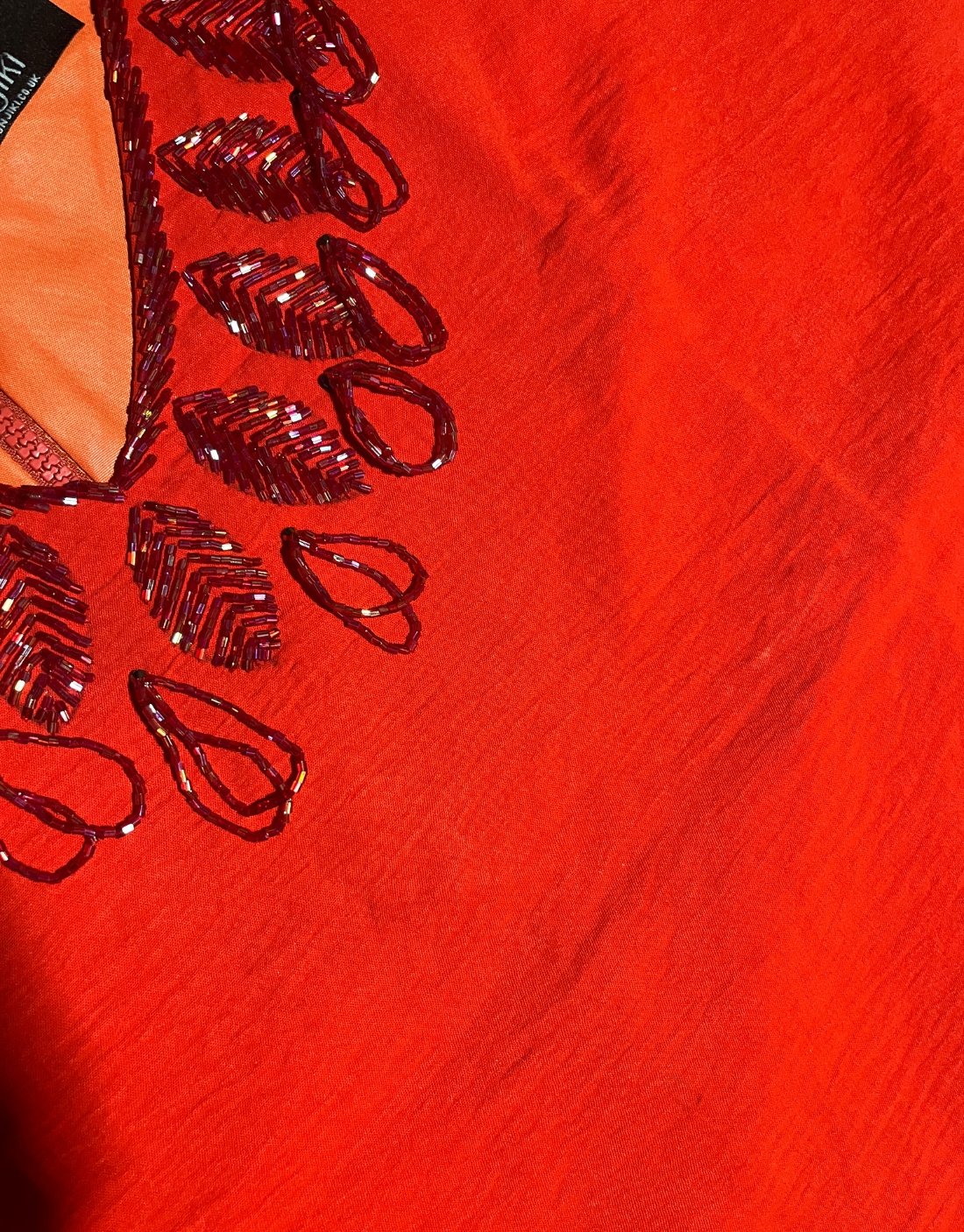 A bold orange sample top in crinkled chiffon, fully lined with a clean zip closure. The universal fit up to UK 20 and the asymmetric kaftan-style cut are elevated with hand embellishment across the neckline.