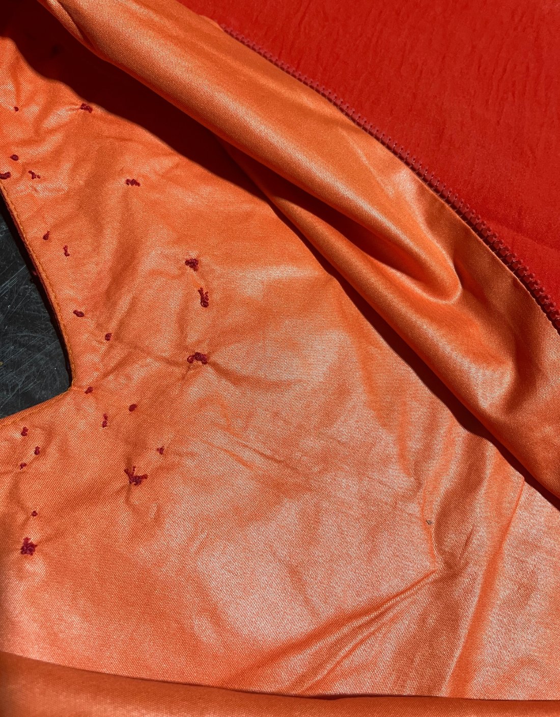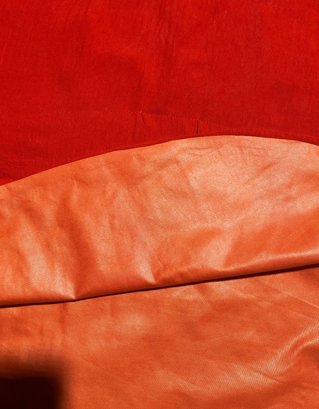 This asymmetric kaftan-style sample piece is cut from lightweight crinkled chiffon in a vivid orange tone. Designed as a universal fit up to UK 20, it offers an easy, fluid drape while the full lining keeps it comfortable and wearable. A concealed zip closure maintains a tidy finish, and the hand embellishment along the neckline adds a refined touch. As a one-off sample, it carries the uniqueness and craftsmanship you expect, making it an effortless statement top for both casual and occasion styling.