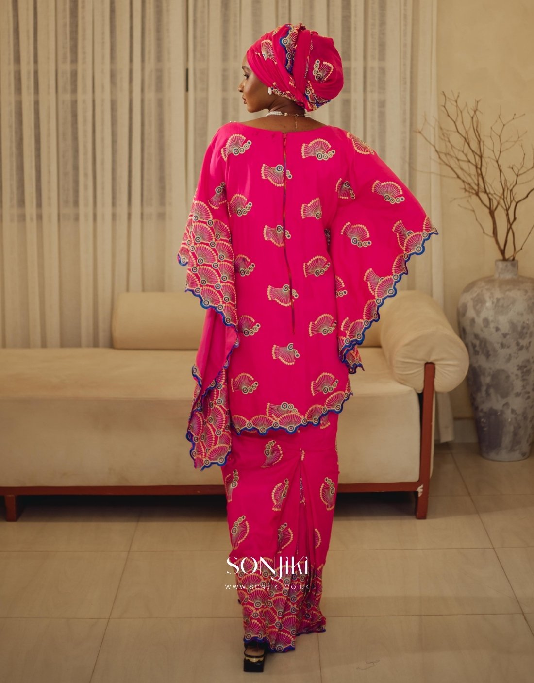 Zahra radiates soft celebration. Crafted from pink Swiss lace with gold, blue and peach detailing, it blends cultural richness with modern femininity.