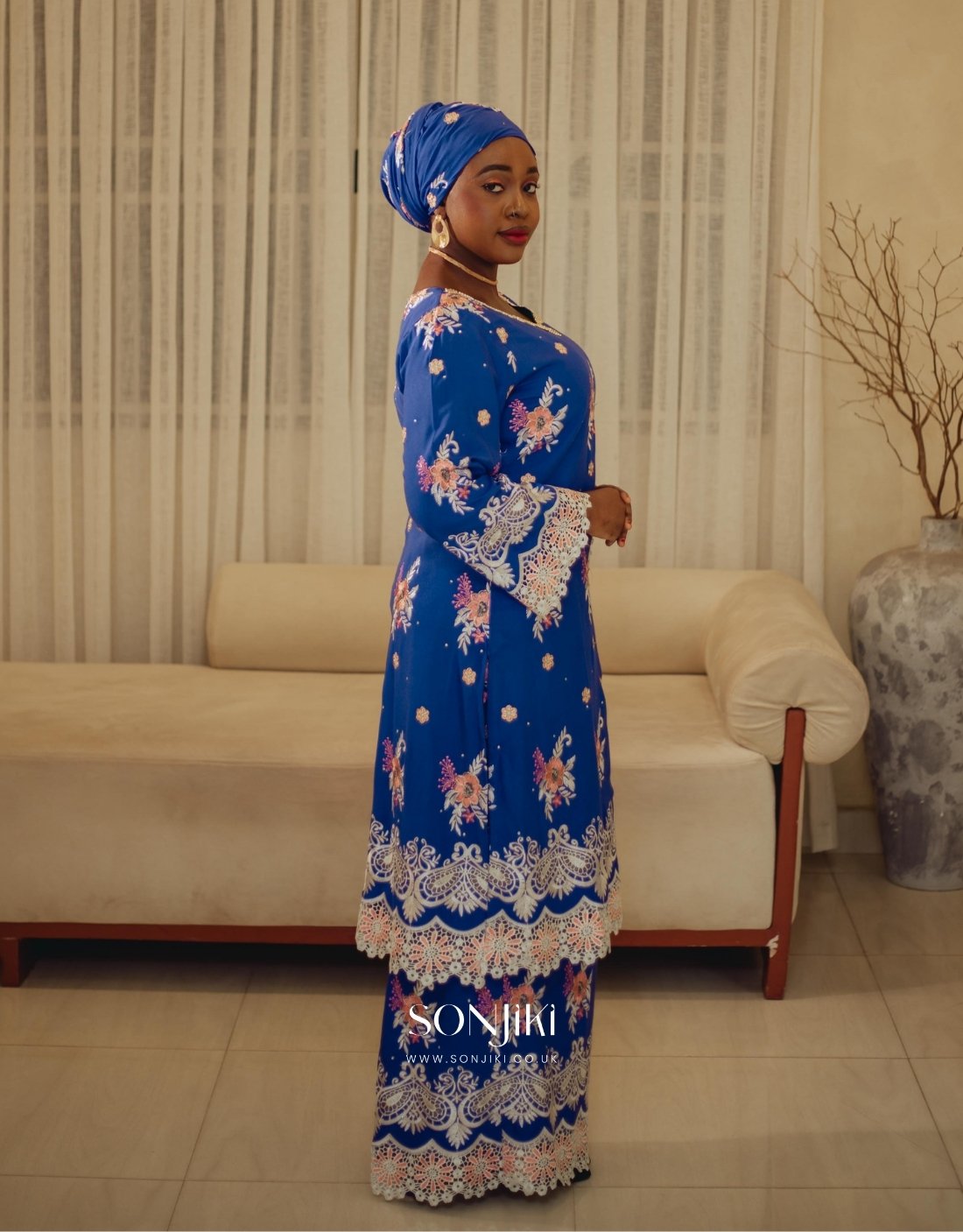 Rukayyah is heritage in motion. Crafted from premium royal blue Swiss lace, it features gold embellishment, white lace touches and peach accents for depth and craftsmanship.